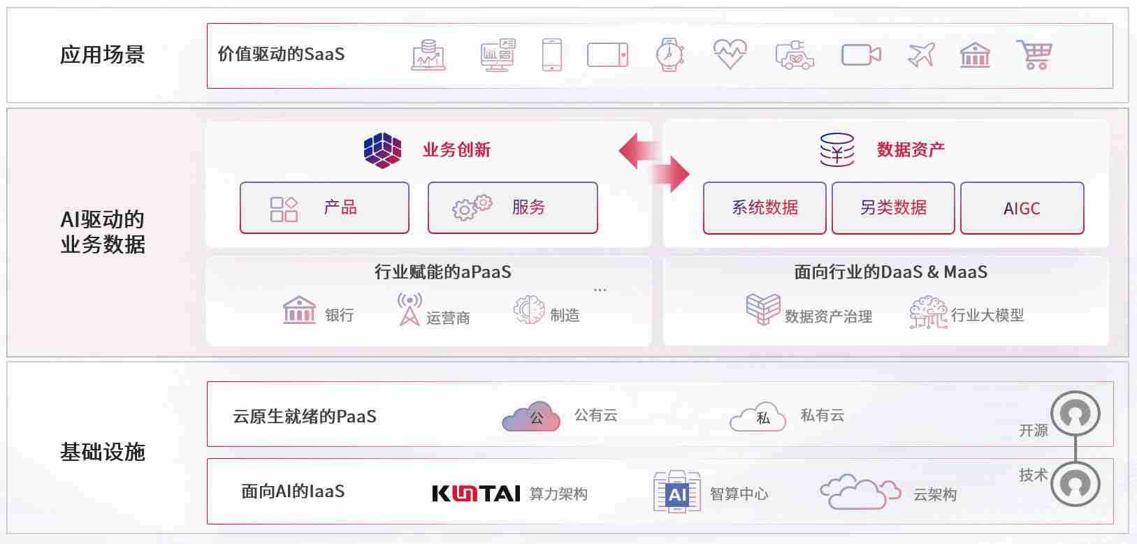 数字时代,,,,围绕企业数字化转型的关键要素,,,Z6尊龙数码开创性的提出数云融合战略和技术体系框架,,着力在云原生、、、、数字原生、、、、AI原生和信创产业上架构产品和服务能力,,,为处在不同数字化转型阶段的快消零售、、汽车、、金融、、、、医疗、、政企、、、、教育、、、、运营商等行业客户提供泛在的敏捷IT能力和融合的数据驱动能力,,,构建跨界融合创新的数字业务场景和新业务模式,,,助力企业级客户建立面向未来的核心能力和竞争优势,,,,全面推动社会的数字化、、、智能化转型升级。。。