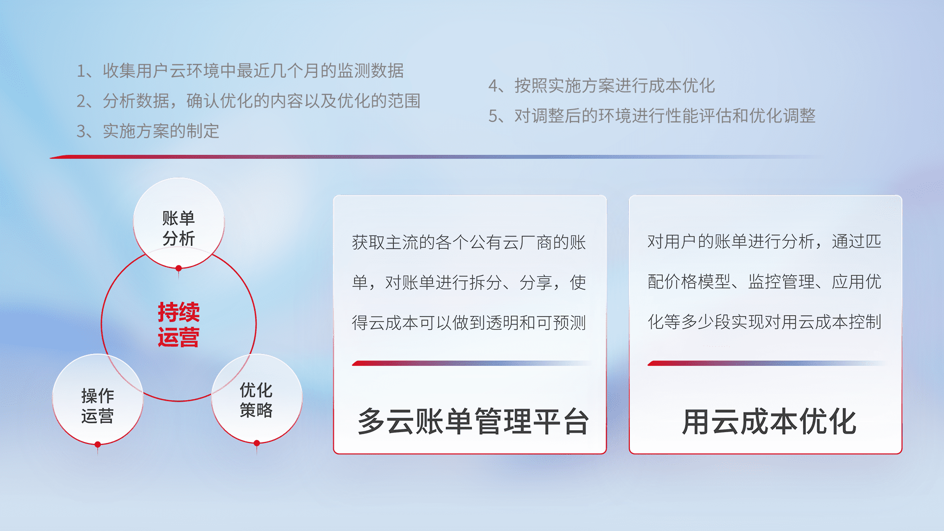 通过多云纳管,,,,以统一的资源数据模型把客户的云资源进行抽象和封装,,进而实现对多云资源的统一操作,,,保障云资源管理的可靠性、、、稳定性与可用性。。。量身定制化运维内容,,配置、、开发运维、、补丁管理、、备份、、监控、、认证和访问管理、、审计和日常巡检等,,,,保障在用云过程中的可靠度,,,,稳定度以及高可用率。。